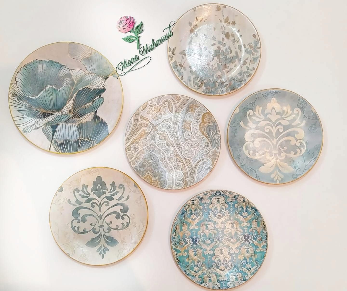 A soft and elegant mix of modern patterns and floral designs in light blue with gentle touches of gold. This set brings a fresh, calming feel to any wall space with its delicate details and chic style.